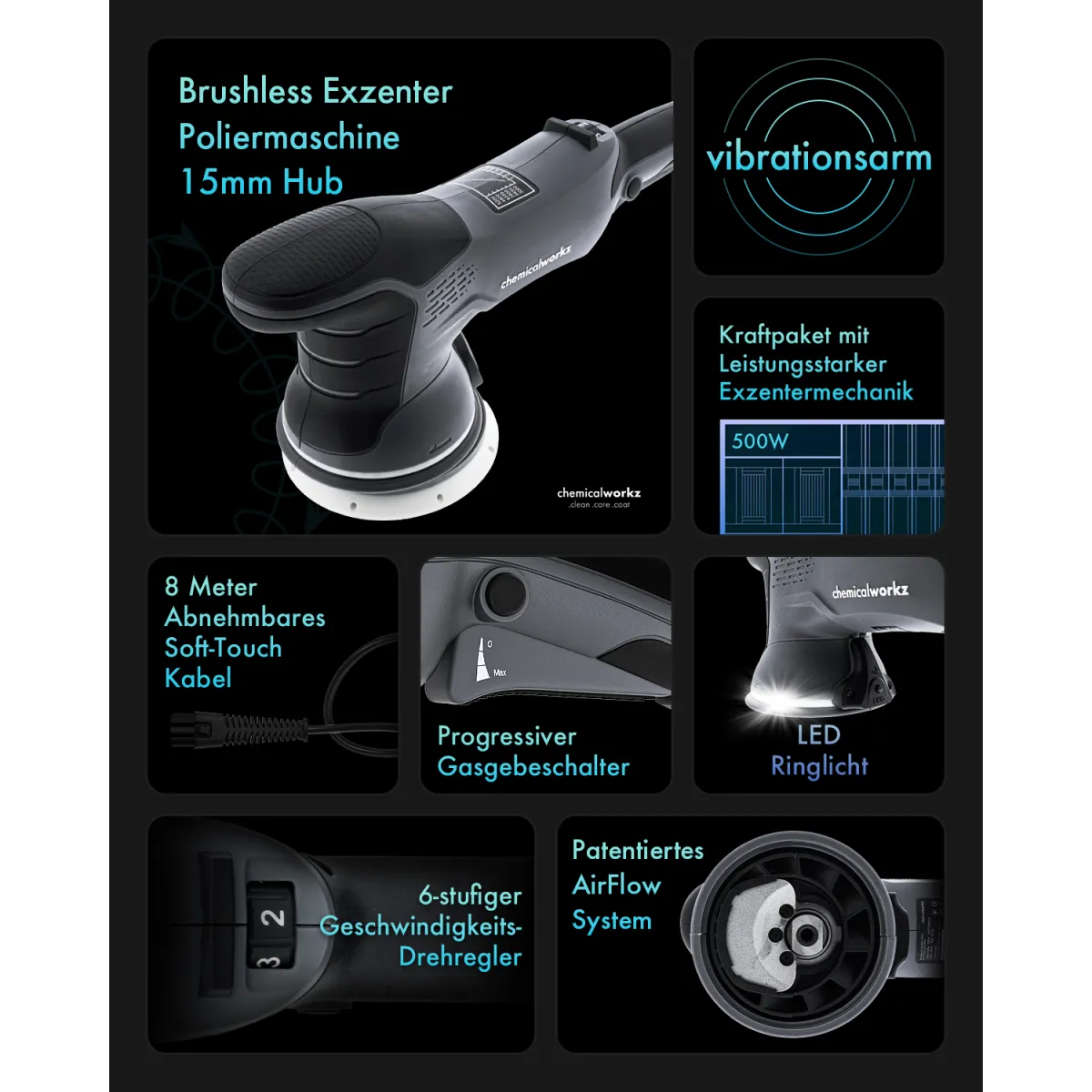 A máquina de polir sem escovas DA15 Pro da chemicalworkz® é a máquina ideal para quem busca correção eficiente de defeitos, acabamento seguro e tecnologia de ponta em um único equipamento. Com um curso de 15 mm, um potente motor sem escovas de última geração e um design ergonômico, ela é a ferramenta perfeita para profissionais de detalhamento automovél e entusiastas ambiciosos.